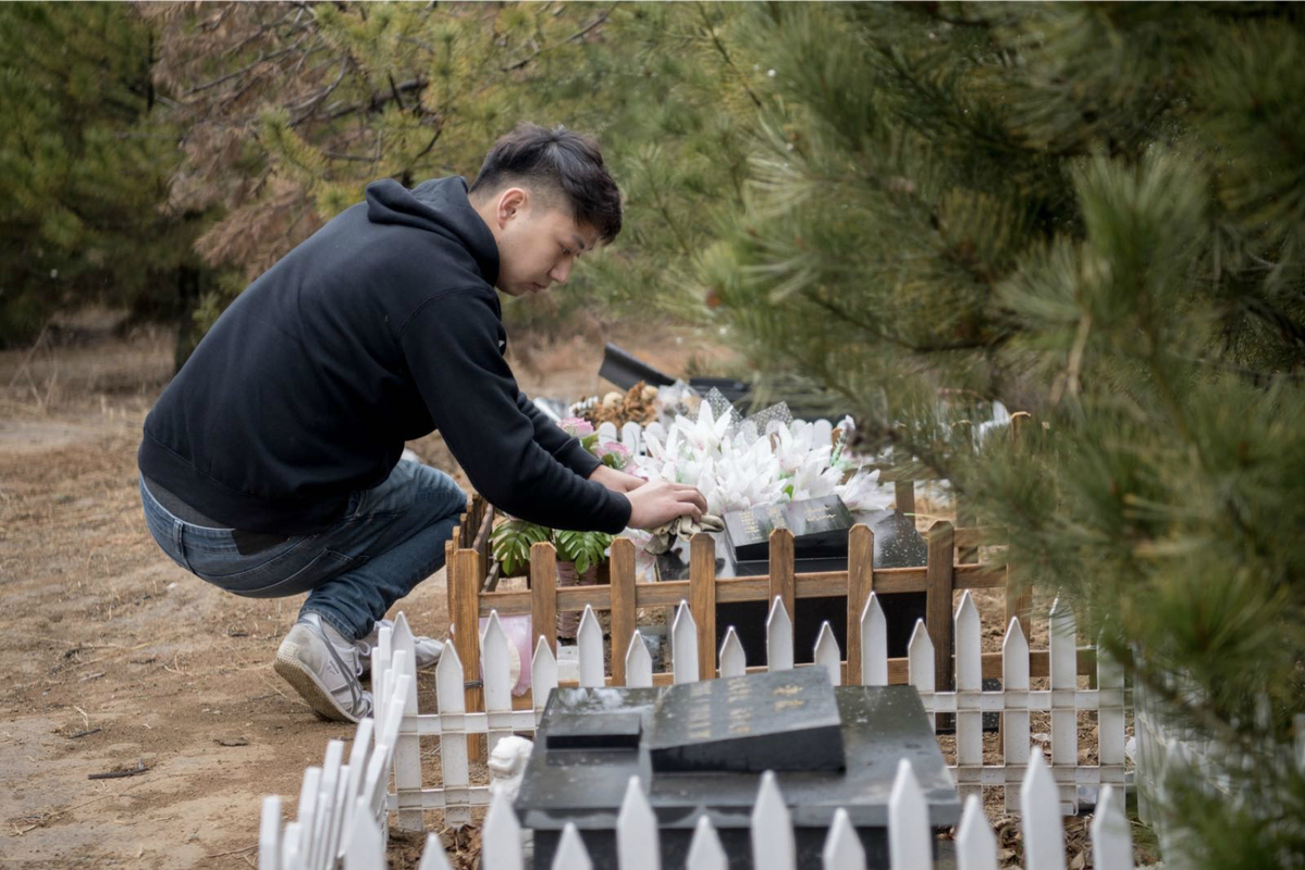 何杰在宠物墓地擦拭墓碑。从业两年来,他相继送走了近500只宠物。