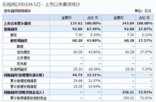 据券商网报道,在2010年至2016年的7年时间里,乐视网的筹资活动现金流净流入178.43亿元,是经营现金流的33倍,同时,投资活动现金流净流出169.75亿元,是经营现金流的31.67倍。