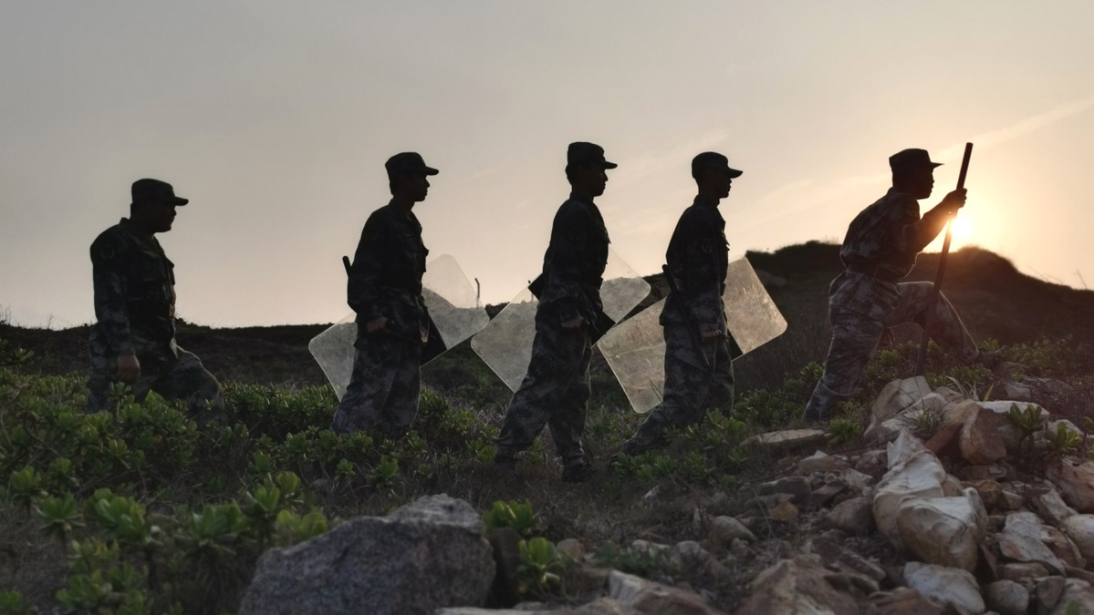 (夕阳西下,哨兵们行走在巡防线上。陈建文 摄)