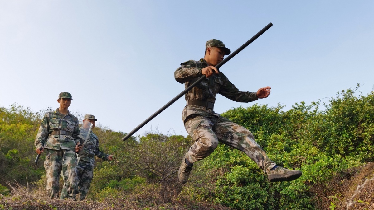 (图为哨所民兵在进行跨濠沟训练。陈建文 摄)