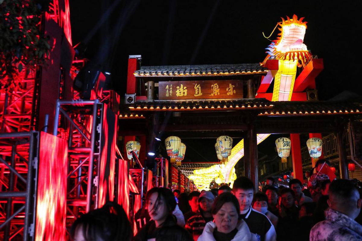 走进宋渠直街,一条几十米长的巨龙,上万盏花灯,引得众多游人接踵而至。沿直街的溪水上,鱼灯带、兔子灯带、吉伞灯带等鳞次栉比,美轮美奂。石墙灰瓦、雕梁画栋在灯光掩映下,让人恍若梦回南宋的繁华景象。
