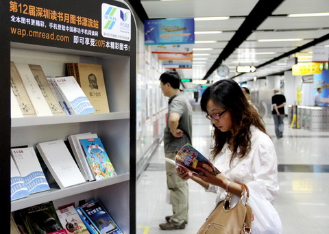 (图为市民在地铁站里的图书漂流站取书阅读。——张定平 摄)