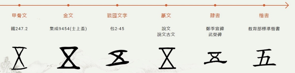 五,是指事词,等于“二 乂”。“二”代表天地,heaven and earth,“乂”表示互相交错,英语可以翻译为cross。《说文解字》给出的解释是天地间交汇的万物,代表了木、火、金、水、土等宇宙的构成要素。