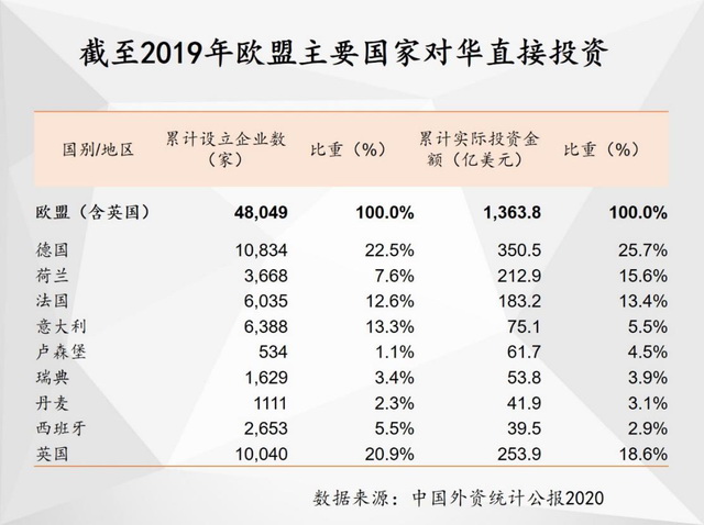 与中欧贸易的持续火爆相比,中国与欧盟的相互投资则在低水平运行,与双向巨量贸易严重不匹配,成为中欧合作的短板。截至2020年11月,欧盟27国对中国实际投资1179.8亿美元,累计设立投资项目数量超过3.8万个。截至2020年11月,中国对欧盟27国累计直接投资超过800亿美元。据欧洲统计局统计,2019全年,欧盟27国对华直接投资为72.2亿美元、中国对欧盟(除英国)直接投资94.2亿美元。