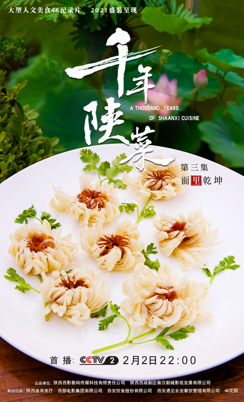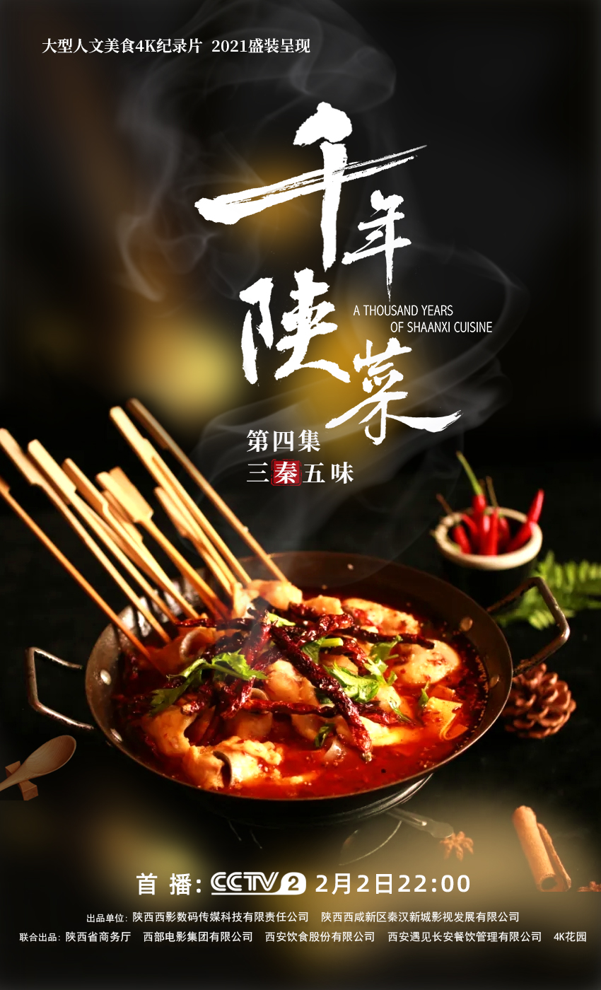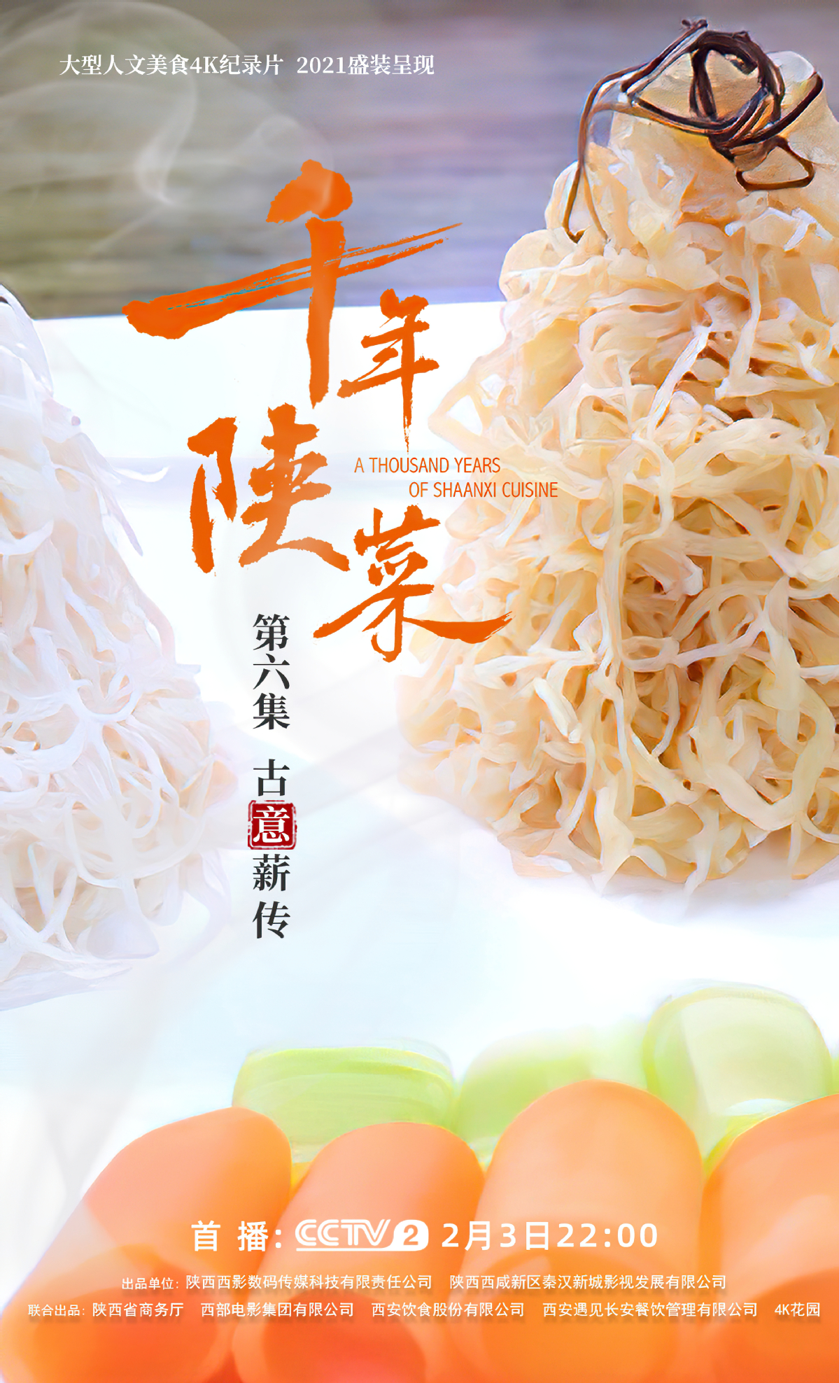 色、香、味、型、美俱佳的陕菜,是中国最古老的菜系,历史悠久,经过数千年的发展和流转,兼容并蓄,一直在积淀和丰富着中华美食文化,滋润和刺激着老陕和天下华人的舌尖味蕾,激荡老陕和天下华人和华侨心灵深处的柔弱且温暖的乡愁。2月1日起由西影集团数码传媒基地与陕西西咸新区秦汉新城影视发展有限公司共同出品、陕西省商务厅、西影集团联合出品的六集4k超高清大型美食纪录片《千年陕菜》在中央广播电视总台央视财经频道晚十点档播出,每日两集。并同步在优酷视频、爱奇艺、腾讯视频上线。该片系统性地探究历史演化过程中陕西美食的流变,为陕菜正名,深挖陕菜背后那些鲜为人知的故事和人物,审视陕西美食的独特性,以美食为窗口,传递文化自信,助力陕菜振兴,助推陕西旅游。