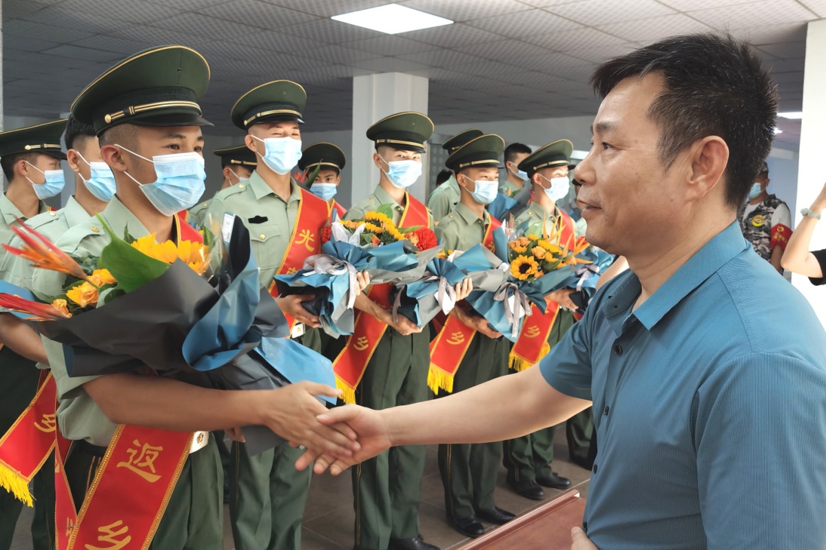 (图为汕头市退役军人事务局副局长袁榜丛在龙湖区退役军人服务中心为该区退役返乡的老兵举行欢迎仪式。杨应森 摄)