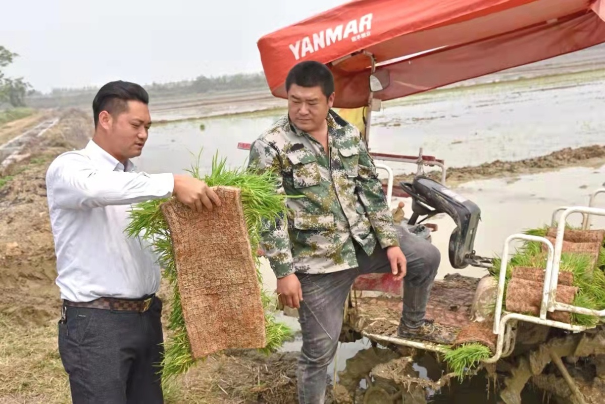 (图为马学杰[左]正在田里指导他的伙伴插秧。资料)