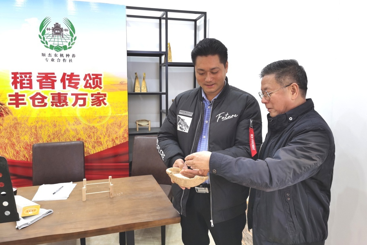 (图为马学杰[左]正向作者介绍他的‘丝苗米’。 姚欣杰摄)