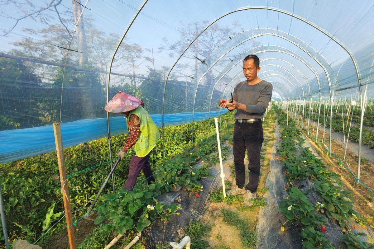 (图为陈燕鹏[左]在田里指导农户种植百香果。刘文钊 摄)