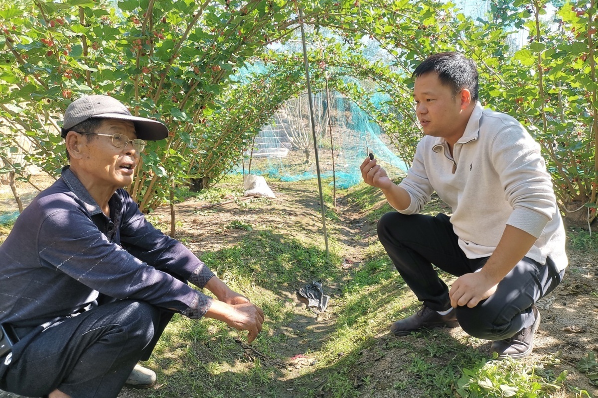 (图为陈燕鹏[右]在果园基地向农户了解桑葚生长及产量情况。陈俊雁 摄)
