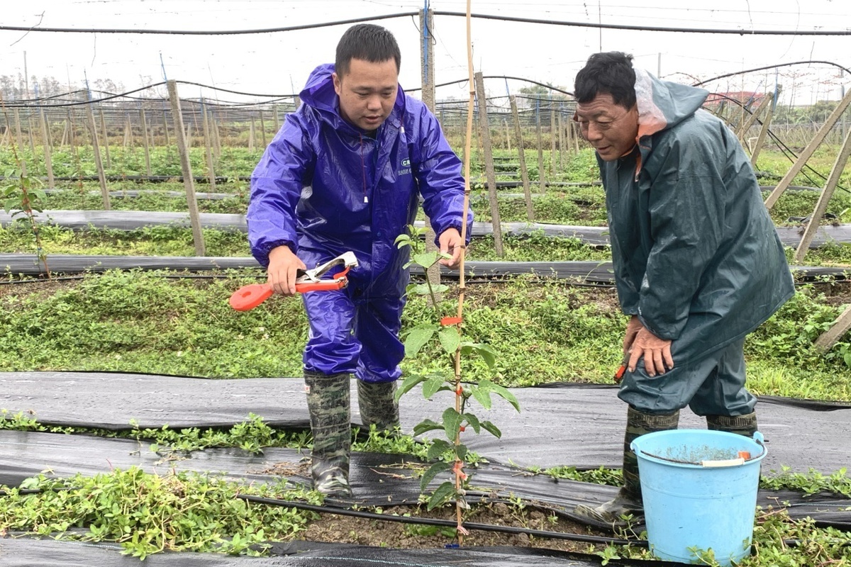 (图为金卓满[左]正在手把手地帮助陈齐伟提高种植知识。洪金泓 摄)
