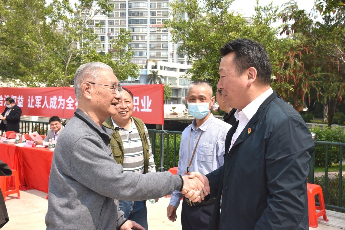 (图为汕头市退役军人事务局局长孟令伟[右] 在该局举办的《退役军人保障法》宣传活动间与老兵们亲切交谈。刘谷婷 摄)
