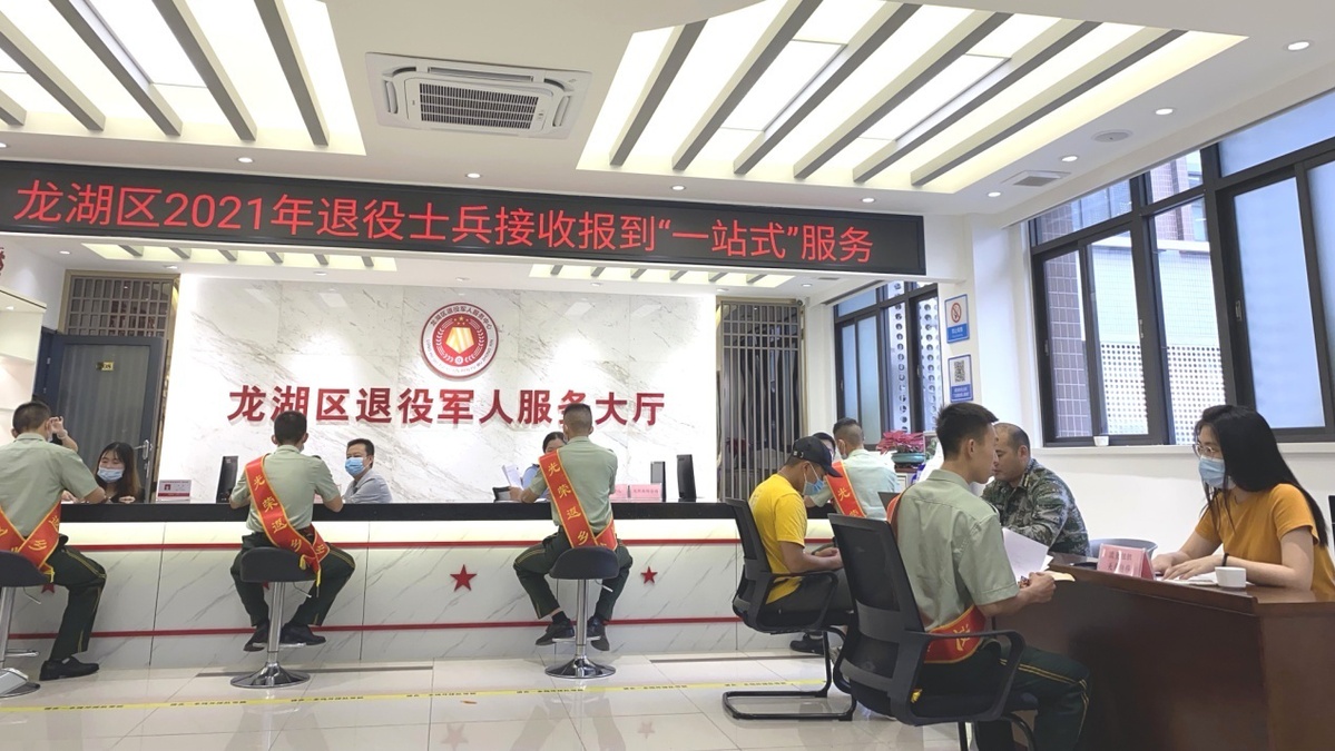 (图为龙湖区退役军人服务大厅正在为退役士兵返乡报到进行“一站式”服务。杨应森 摄)