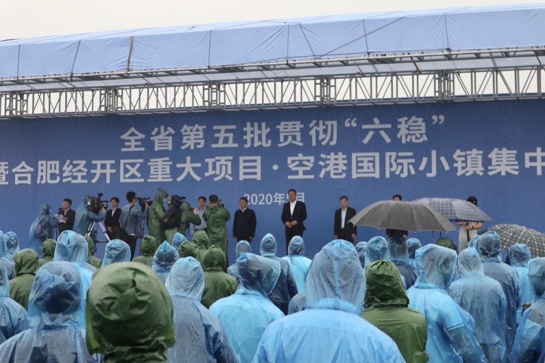 2020年5月8日上午,合肥经开区重大项目·空港国际小镇集中开工动员大会在雨中举行。(朱立新 摄)