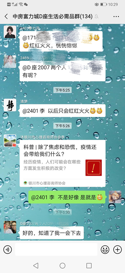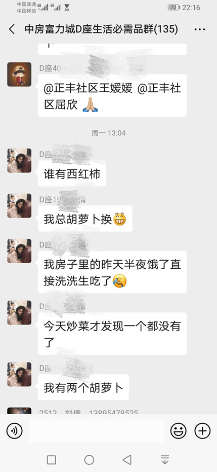 晚上,d座里90户,161人加入了“中房富力城d座生活必需品群”。群主王媛媛和屈欣要通过这个群收集每家每天需要的生活必需品,为大家购买回来。她们接到新华街办事处命令,要尽可能为居民做好服务,保障大家的生活需要。