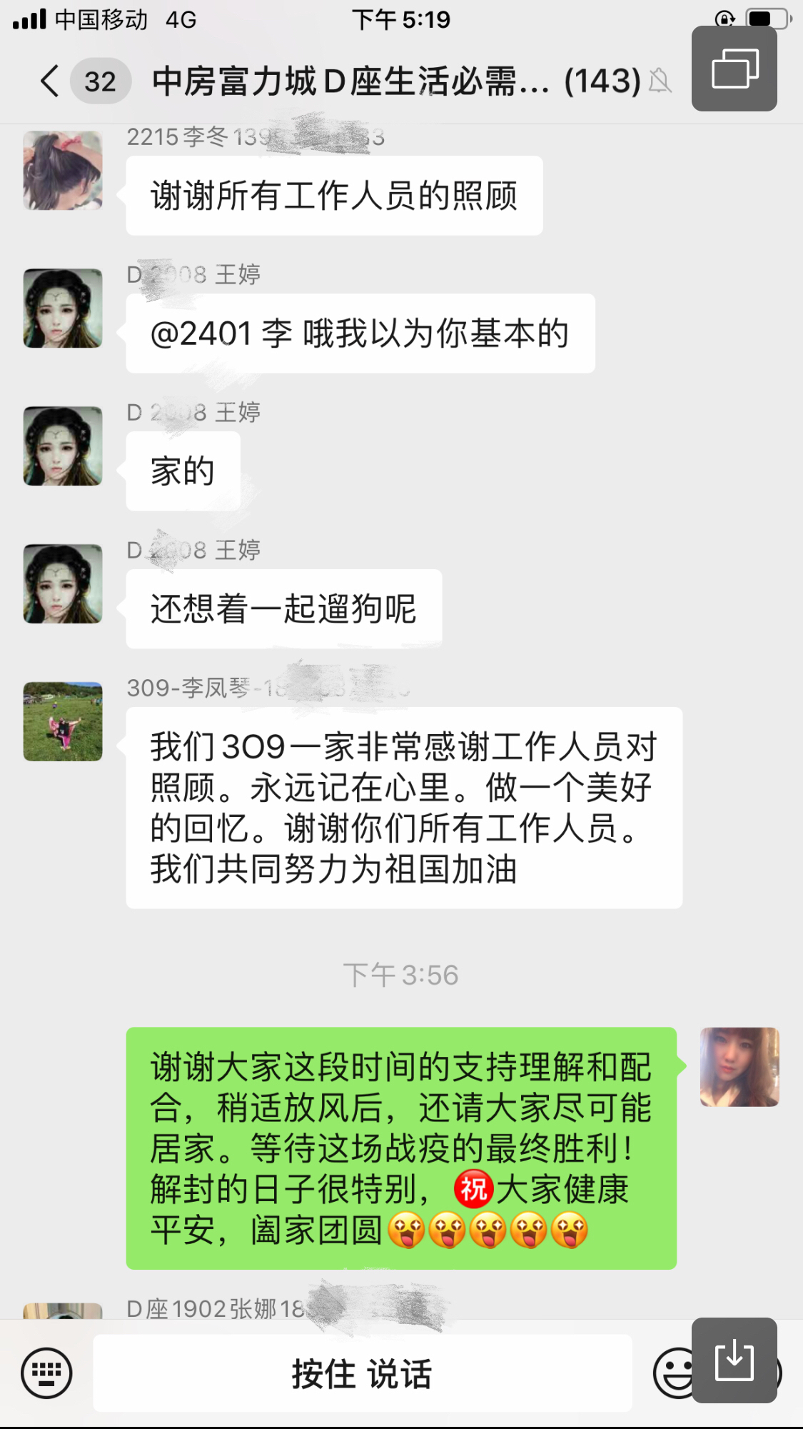 90户,161人,形形色色人走进了一个群,因为隔离,他们的日常生活被紧紧联系在一起。有需要孕检的孕妇,有需要透析的老人,每个人的需求不同,王媛媛说,她们除了身体很累,有时心也会累。毕竟被隔离,每个人的情绪都很容易激动,2月1日,她如往常一样买来菜品分发,由于菜价有些波动,一位居民就在群里指责她多收了自己的钱,媛媛和屈欣各种解释都没有得到那位居民的理解,21岁的屈欣在群里大哭道:我们在这个非常时期到d座为大家服务,一角一分我们都算的清清楚楚,我们从大年初一到现在就没有休息过,还得不到理解,太心寒了!群里的其他居民纷纷批评那位不太讲道理的指责者,安慰两位社区小姑娘。