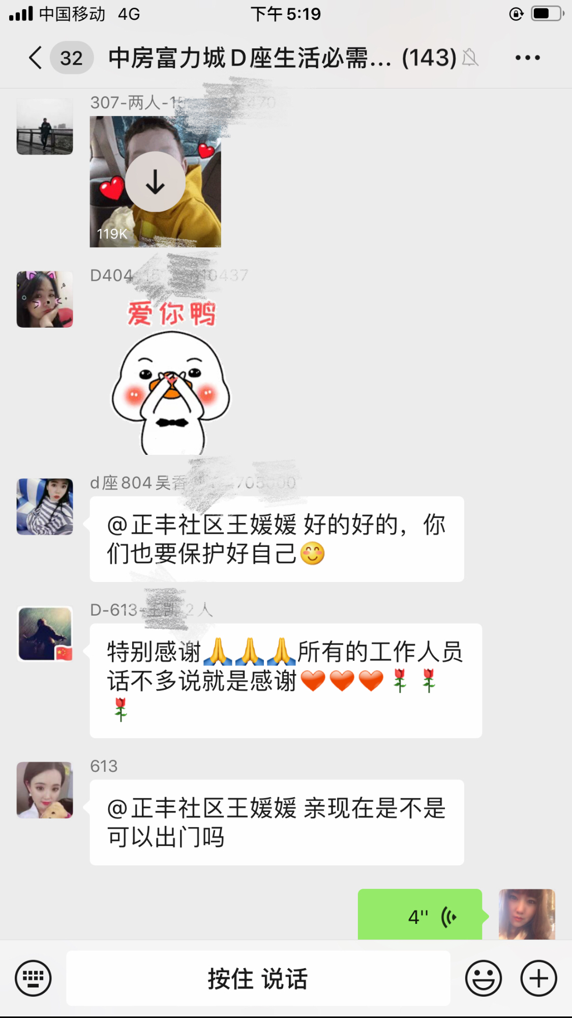 社区的两个小姑娘太辛苦了,我们提出给他们做志愿者,也都被婉拒。我们就在群里互相呼吁,实在解决不了的我们再找社区小姑娘,有些我们d座里自己能解决的困难我们互相帮帮忙。