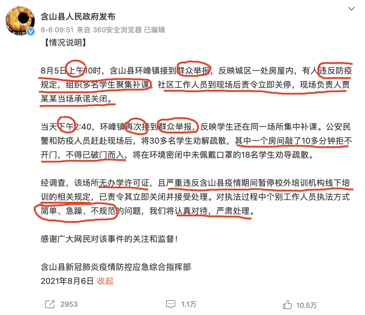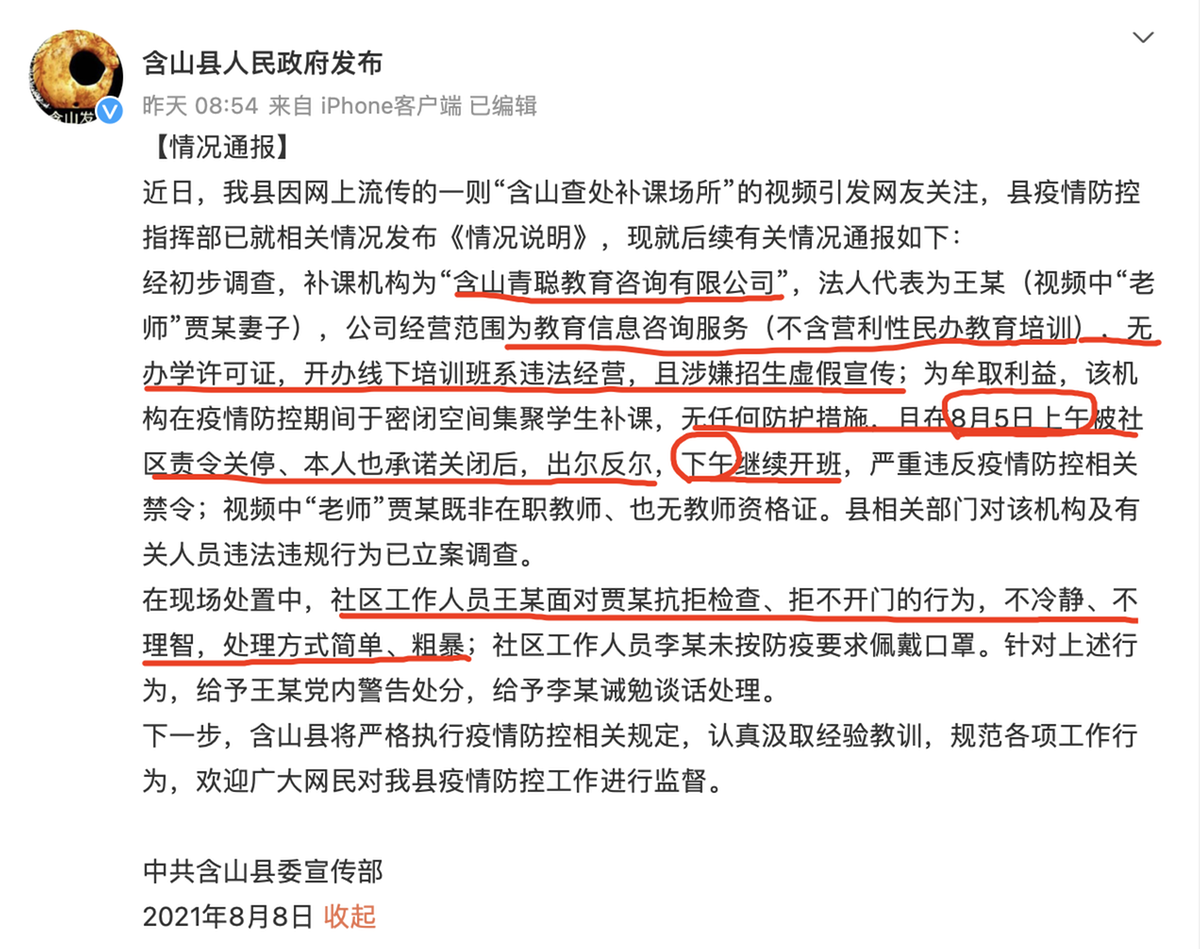 8月6日含山县人民政府发布的第一份情况说明称该培训机构“严重违反含山县疫情期间暂停校外培训机构线下培训的相关规定”,8月8日的第二份情况说明再次说明其“严重违反疫情防控相关禁令”。