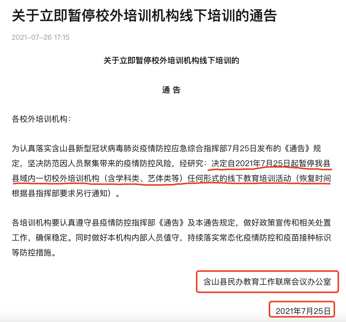 7月25日,含山县民办教育工作联席会议办公室发布的《关于立即暂停校外培训机构线下培训的通告》。