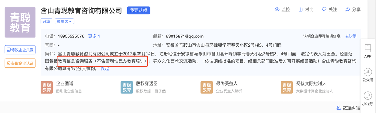 8月8日含山县人民政府发布的第二份情况说明指明涉事培训机构实为“含山青聪教育咨询有限公司”,并称“公司经营范围为教育信息咨询服务(不含营利性民办教育培训),无办学许可证,开办线下培训班系违法经营,且涉嫌招生虚假宣传”。