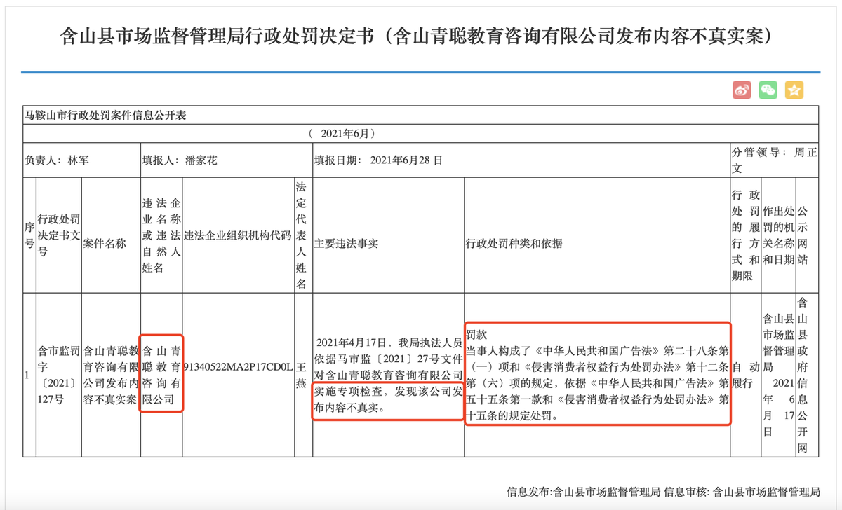 另外,含山县政务公开网6月29日曾发布一份《含山县市场监督管理局行政处罚决定书(含山青聪教育咨询有限公司发布内容不真实案)》,其显示的主要违法事实是:“2021年4月17日,我局执法人员依据马市监〔2021〕27号文件对含山青聪教育咨询有限公司实施专项检查,发现该公司发布内容不真实。”