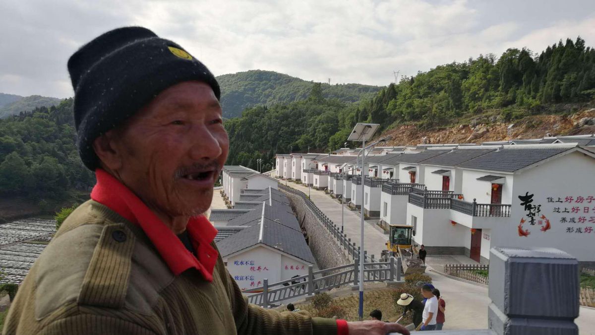 (“俺们一家已搬进新房,日子好得很!”这位86岁的老汉高兴地对我说。摄影:杨应森)