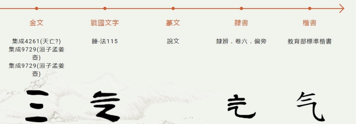 在甲骨文像是“三”,意思是云气层迭形,到战国演变为,渐衍变成云气兴起的样子。后