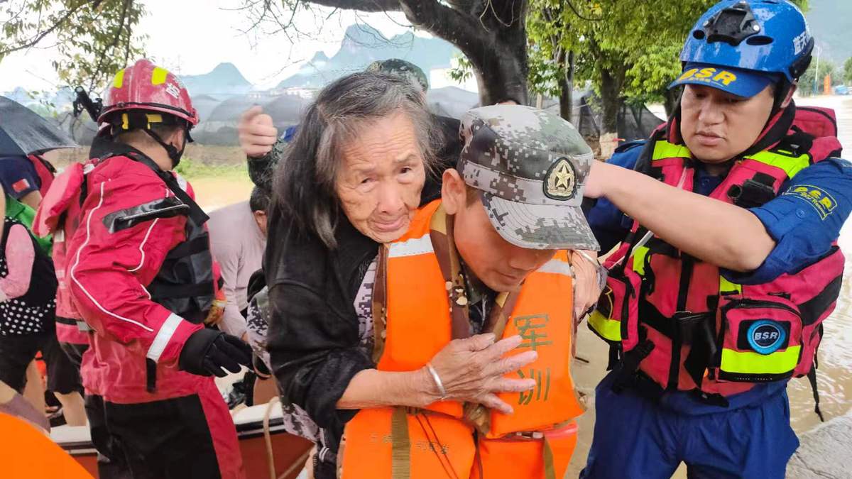 (图为在抗洪救灾中,官兵们迅速将老大娘等老百姓转移到安全地带。殷铁军摄)