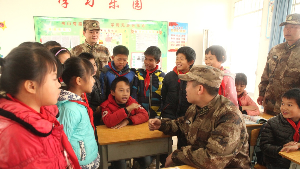 (图为警备区官兵在永福县渔洞小学对学生开展国防教育活动的场面。殷铁军摄)