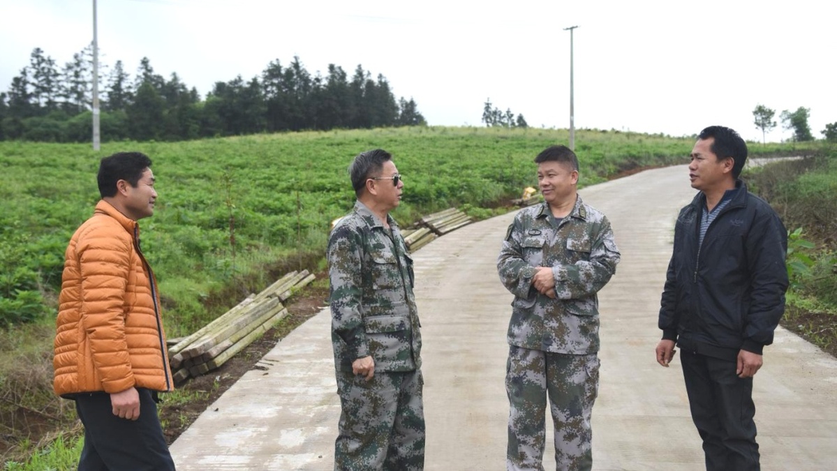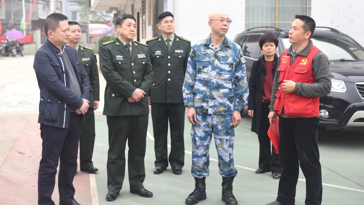 今年“三月三”,司令员张汉川、政委王致踏着泥泞,冒雨来到革命老区阳朔县福利镇屏山村调研,与村干部、民兵商议脱贫后的发展,提出了继续援建党群综合服务中心、文化广场、饮水工程、小学改造建设和护山护水的计划。