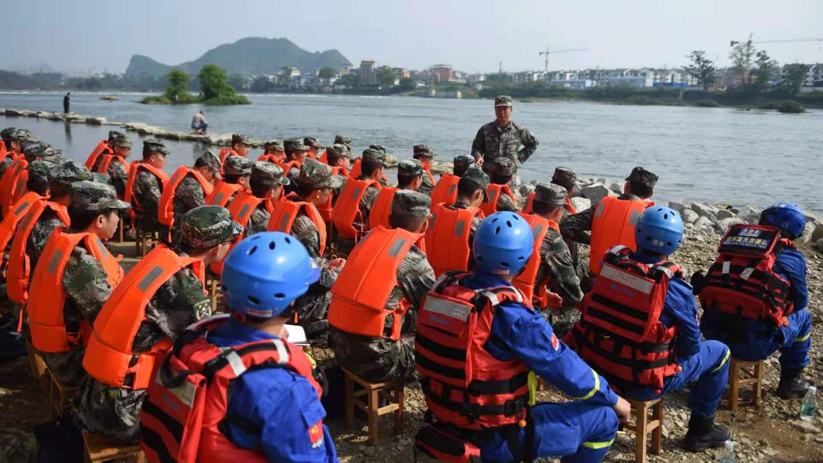 (图为警备区组织民兵在漓江水域进行冲锋舟集训间隙,对集训人员开展思想教育工作。殷铁军摄)