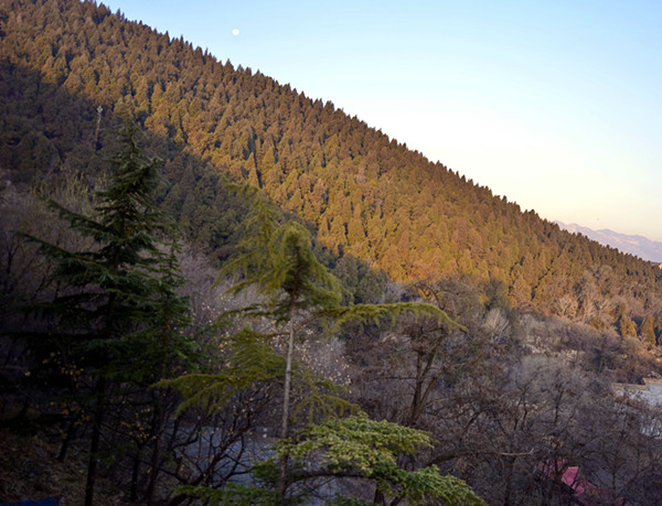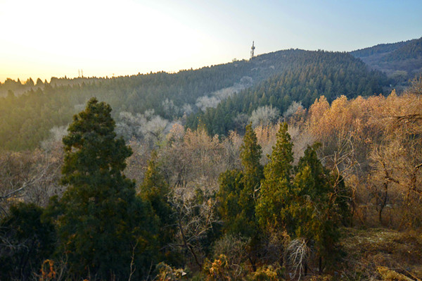 冬日清晨6点多钟,记者穿行在原山密林中的羊肠小道上,林中小路是被雨水冲刷出来的石板路,几十年前栽下的侧柏、刺槐幼苗如今已经变成了茂密的森林,可是山上的土层很浅。许多树根裸露在不足10厘米的土层上面,纵横交错然后扎进石头缝中。风穿过树林发出呼呼的响声,树林深处不时传来各种鸟儿悦耳的叫声。晨练的老人们则用高亢的“啊——哟——哦——”相互招呼着,在密林深谷中久久回荡。登上山顶的望海楼,只见群山起伏,无边的森林被霞光染成金色。