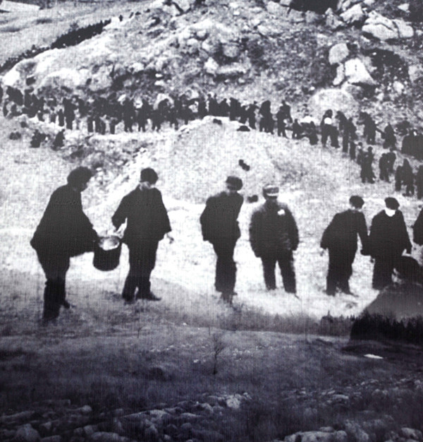 当年百人传水浇树苗的场面