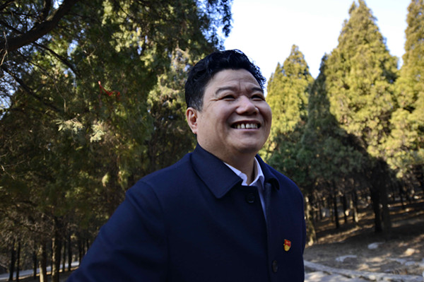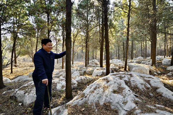 原山林场党委书记、场长孙建博抚摸着长了60年的侧柏说这些树就像是自己的老伙伴一样-鞠传江摄影