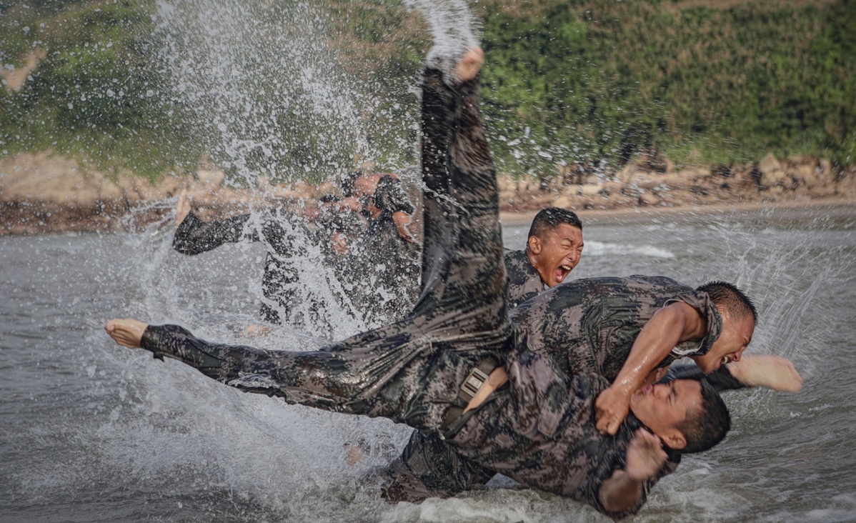 杠铃卧推、负重下蹲、马步推砖、格斗擒拿,在训练场,我观看了“好八连”的特战课目训练。时任连长李旭说,“好八连”坚持从难、从严、从实战,开展濒海训练、潜水训练、反恐训练,在生疏地形、恶劣海域开展战斗攀爬、水上救援等课目训练,并且在复杂气候条件下进行低空跳伞训练,以增强立体突击、空中渗透的特种作战能力。