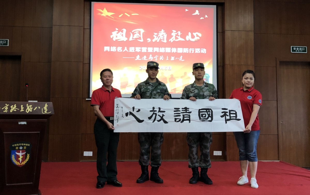 由采访团代表向“好八连”赠送由知名书法家吴培坤先生书写的活动主题:《祖国,请放心》的墨宝。胡雪峰 摄