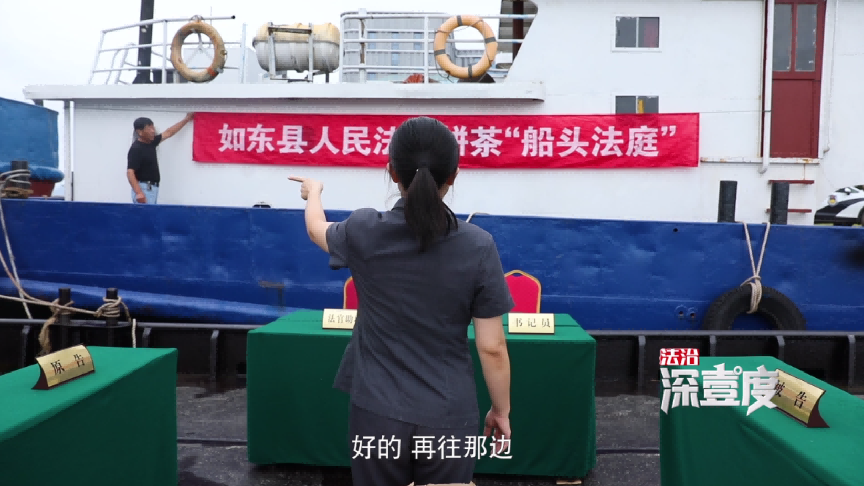 江苏省如东县栟茶镇的渔船码头上,一位年轻的女士正在请两位渔民挂横幅。这可不是什么剪彩仪式,人家横幅上写的清楚,“如东县人民法院栟茶‘船头法庭”。