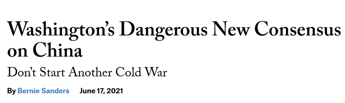 6月17日,美国民主党联邦参议员桑德斯在《外交政策》网站撰文“华盛顿危险的对华新共识:不要开启另一场冷战”,指出美国政界正在形成一种以反华为政治正确的风气,而这对中美关系是极其危险的。