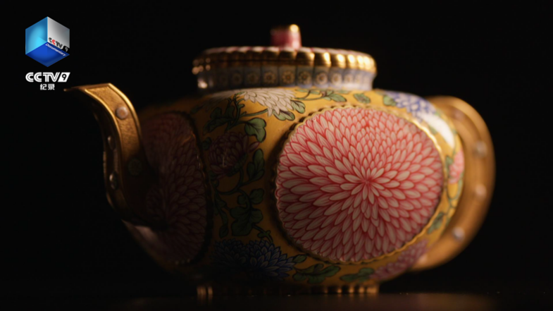 节目中重点呈现的另一件精美展品——乾隆年制款画珐琅菊花纹壶,经故宫博物院研究人员郭福祥和王翯共同研究发现,这件文物是清代宫廷向法国定制的产品,原来在壶底部"乾隆年制"款识的上面,刻有法国工匠的签名coteau。路易十五时期,法国化学家研究了被带回到法国的高岭土成分,于是全法国努力寻找高岭土,终于,1768年,在利摩日地区发现了这种矿物质,法国逐渐掌握了制造硬瓷的秘诀之一高岭土。