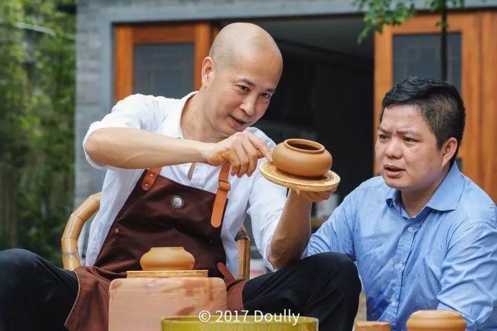 (左图)国家级非遗传承人谢华在向徒弟讲述手拉朱泥壶制作工艺;