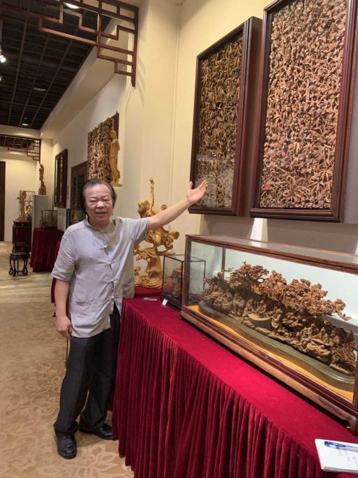 (右图)国家级非遗传承人辜柳希在介绍其木雕制作技艺。