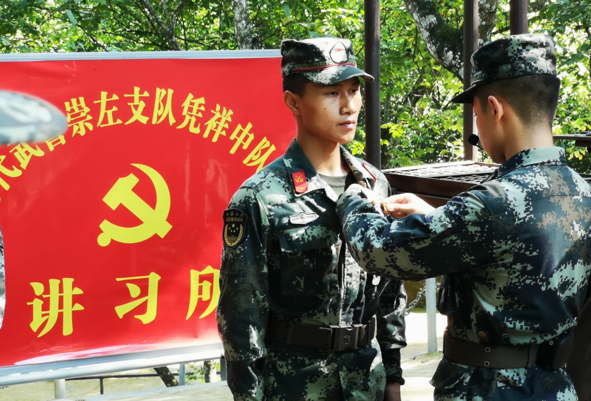 图为凭祥中队战士在入党仪式上被授予党徽。 许东 摄