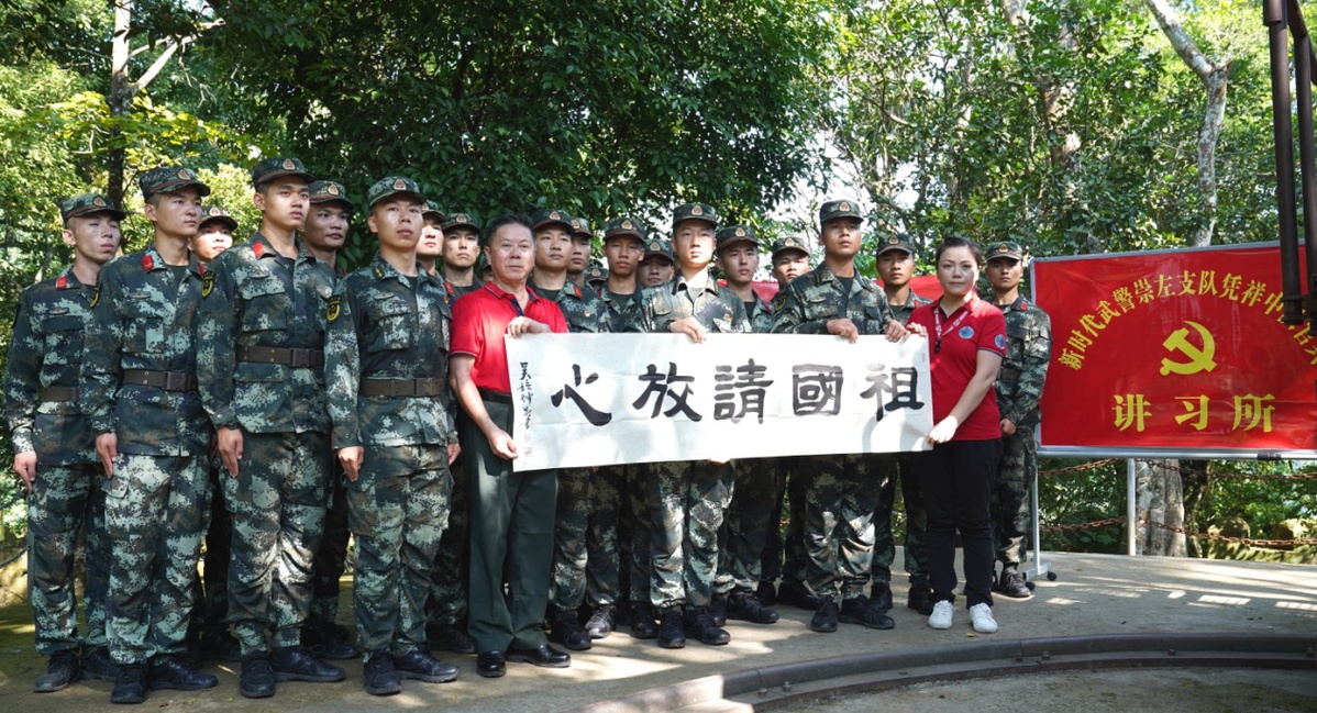 采访团代表向凭祥中队赠送由知名书法家吴培坤先生专为活动主题书写的《祖国,请放心》的墨宝。 王云苗 摄