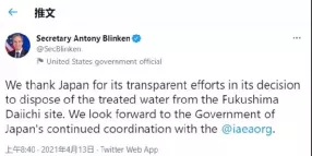 几乎就在同时,美国国务院发表声明,对日本这一决定表示支持。美国国务卿布林肯甚至在推特上发声,对日本这一行为表示感谢。