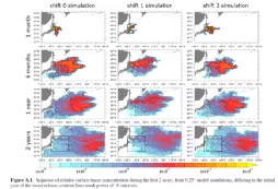 该论文在0.5度、0.25度、0.1度三种精度下对北太平洋的洋流进行了建模,在建模的基础上假设日本福岛将含有放射性元素铯137的废水排进太平洋,连续排2-3周,在这一基础上按日估算了北太平洋各区域的铯137含量。