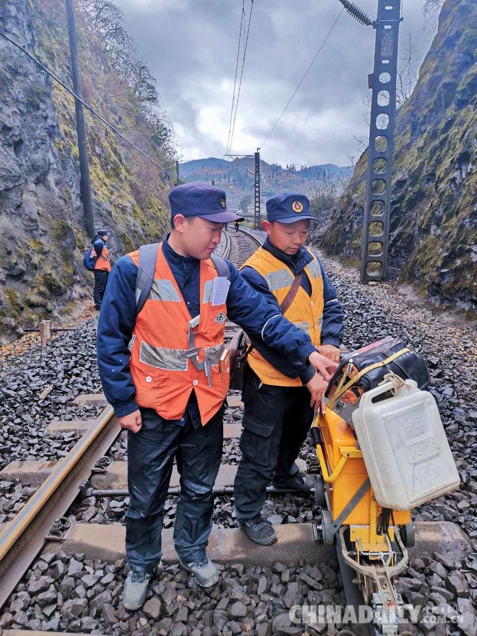 每天早上,他们都会搭乘一辆班车来到凯里工务段。这条线路连接着贵州黄丝镇和龙里县两地,铁路两侧是高耸的大山。到达工作地点后,队员们开始例行检查。“我们一般利用列车运行间隙开展作业,每天大概需要避车上下轨道60多回。
