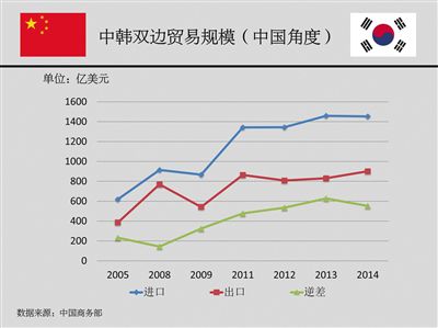 中韩自贸区协议生效后将会极大刺激双边贸易,专家预计五年内双方的贸易规模将从目前的年近3000亿美元增至4000亿美元。面对这一协议带来的好处,连韩国总统朴槿惠对企图阻挠协议通过的政客都发出了“伪善并玩忽职守”的强烈抨击,因为协议生效每推迟一天,就会给韩国带来40亿韩元(约合人民币2228万元)出口利益的损失。韩中两国建交23年来,两国的贸易规模从建交时的年60亿美元增加到去年的2350亿美元,中国已经成为韩国最大的贸易伙伴,而韩国也成为中国的第三大贸易伙伴。去年韩国对中国贸易的顺差达到475亿美元。