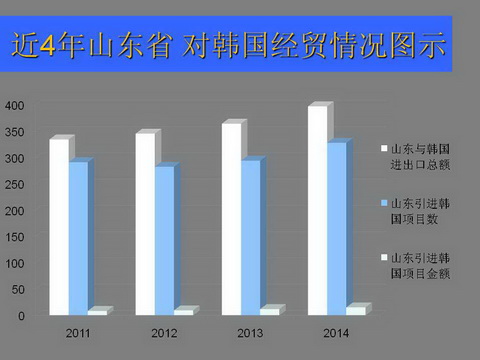 山东半岛是韩国企业进入中国的便捷门户和交通枢纽,拥有两国间最密集的海、空中航线和陆海联运通道。山东半岛几个城市每天往返韩国的空中航班超过100个,海上航线19条,每周客货航次90多个。1至10月份,来山东省旅游的韩国游客达到50万人次,占全国的1/6。来自山东商务厅的统计数据显示,去年,山东与韩国进出口总值328亿美元,占中韩两国贸易总额的11%,增长10.4%,韩国在山东实际投资15.3亿美元,增长27.5%。截止目前,韩国在山东的实际投资累计达316.7亿美元,有5000多家韩资企业在山东投资发展。今年前三季度,山东对韩国进出口240.7亿美元,增长11.6%。双方投资也持续增长。今年1-8月,韩国对山东投资项目为359个,同比增长36%。包括三星、现代、lg等韩国前30位的大企业集团都将重点项目放在山东,这些项目90%以上集中在山东半岛。居住在山东半岛各个城市的韩国侨民超过20万人。这些说明山东与韩国的经贸关系是何等密切!