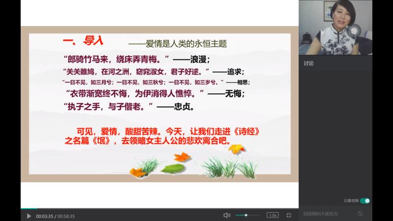 今天的第一节网课她选择了讲《诗经》中的名篇——《氓》,怎么面对镜头,有镜头感,以什么样的状态在同学们面前亮相呢!