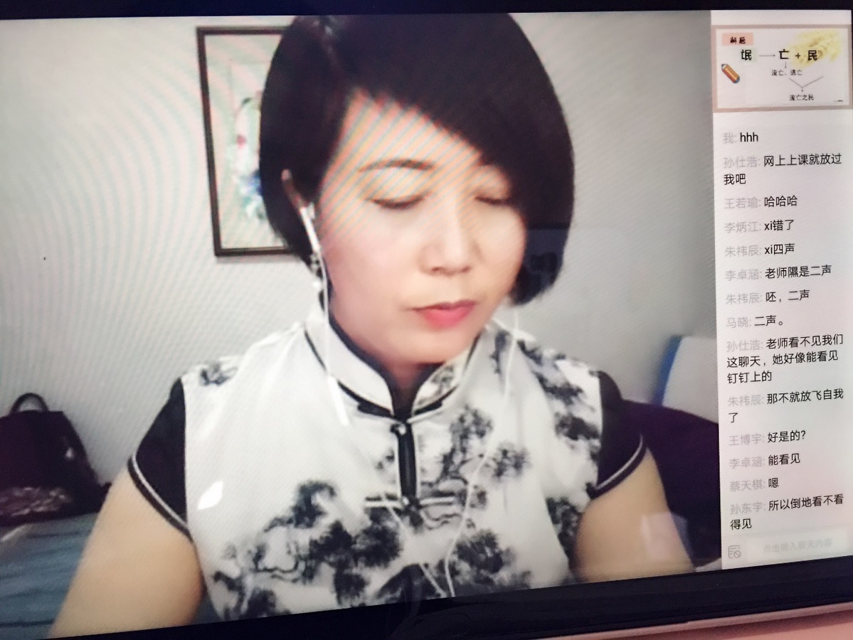 直播中,让王淑珍感动的是孩子们都很配合,很认真,为了让同学更好感受到《氓》的意境,她在直播课中播放了自己精心准备的于文华老师演唱的《氓》,下边竟然有同学打字说“我听的都想哭”,看来孩子们入境入情了。王淑珍及时和孩子们互动连麦,像平时课堂上一样,孩子们很动情地朗诵,也感动和感染着她!